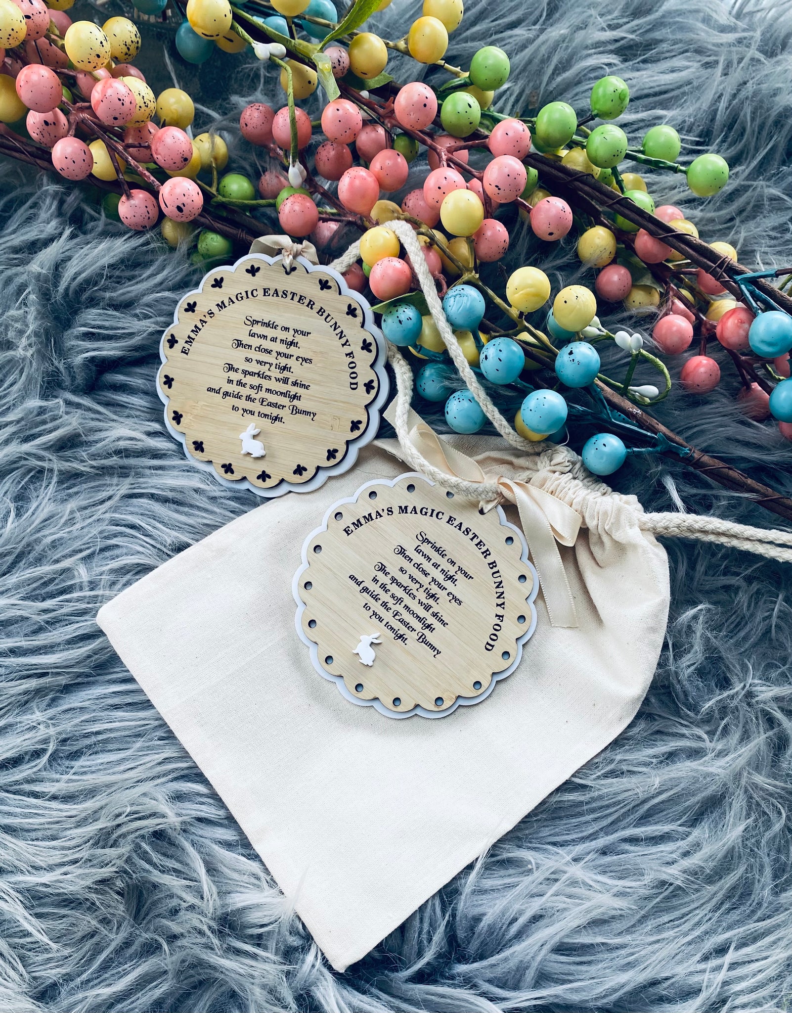 The bag is finished off beautifully with a personalised vintage style tag, complete with a whimsical poem to guide the Easter Bunny straight to your home.