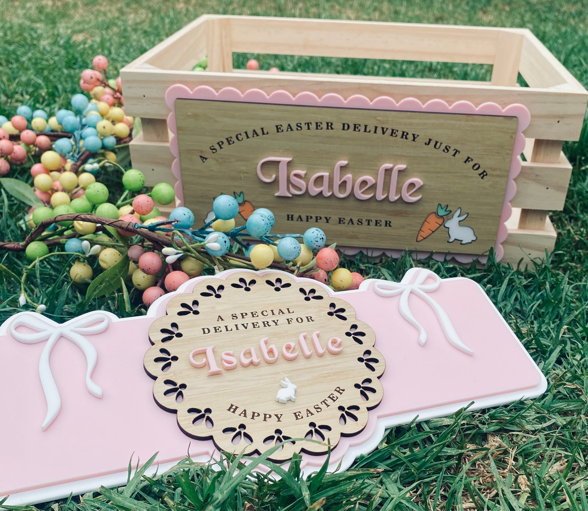 Designed to sit proudly on the front of your crate, it adds that personalised touch that turns a simple basket into a treasured Easter tradition.