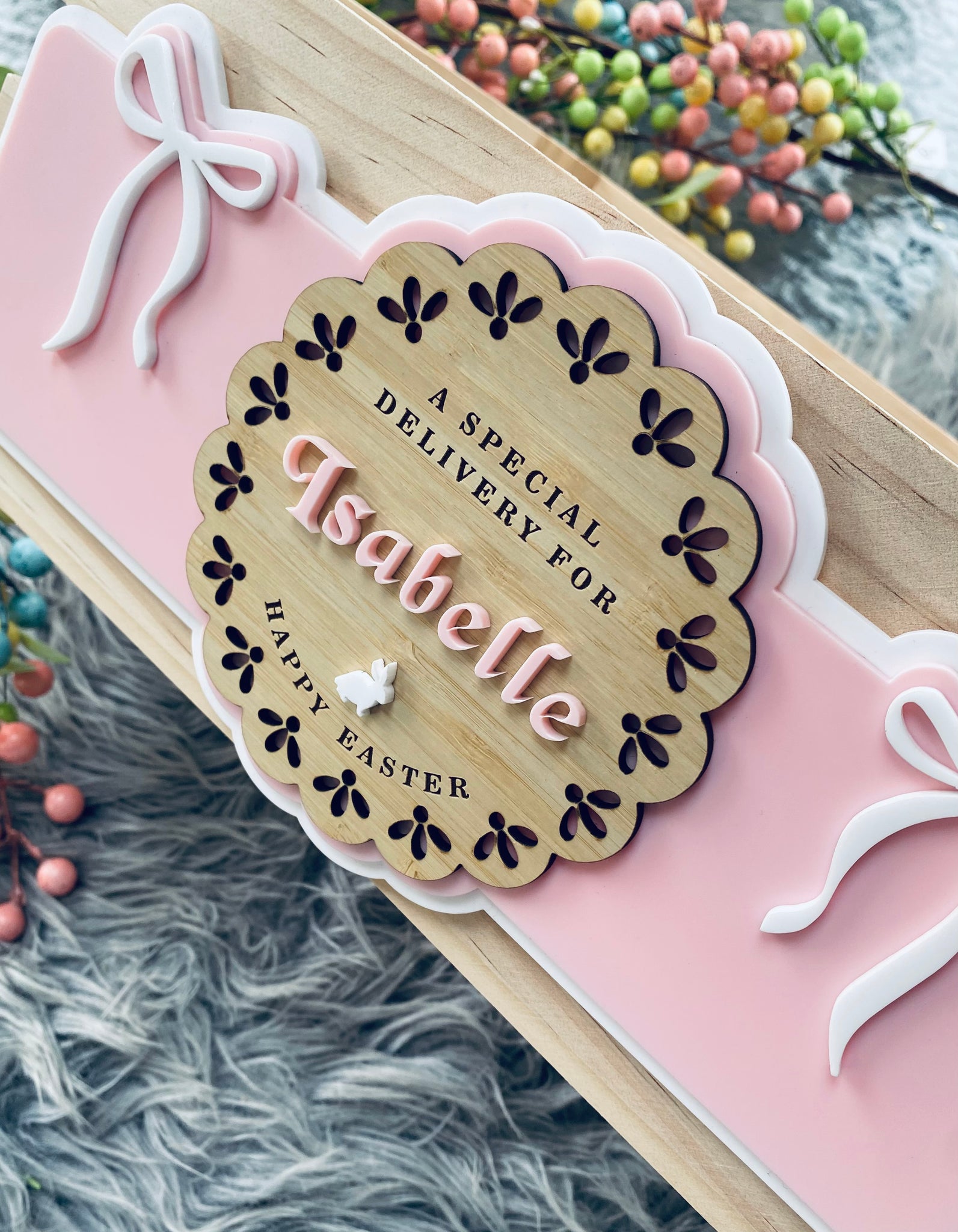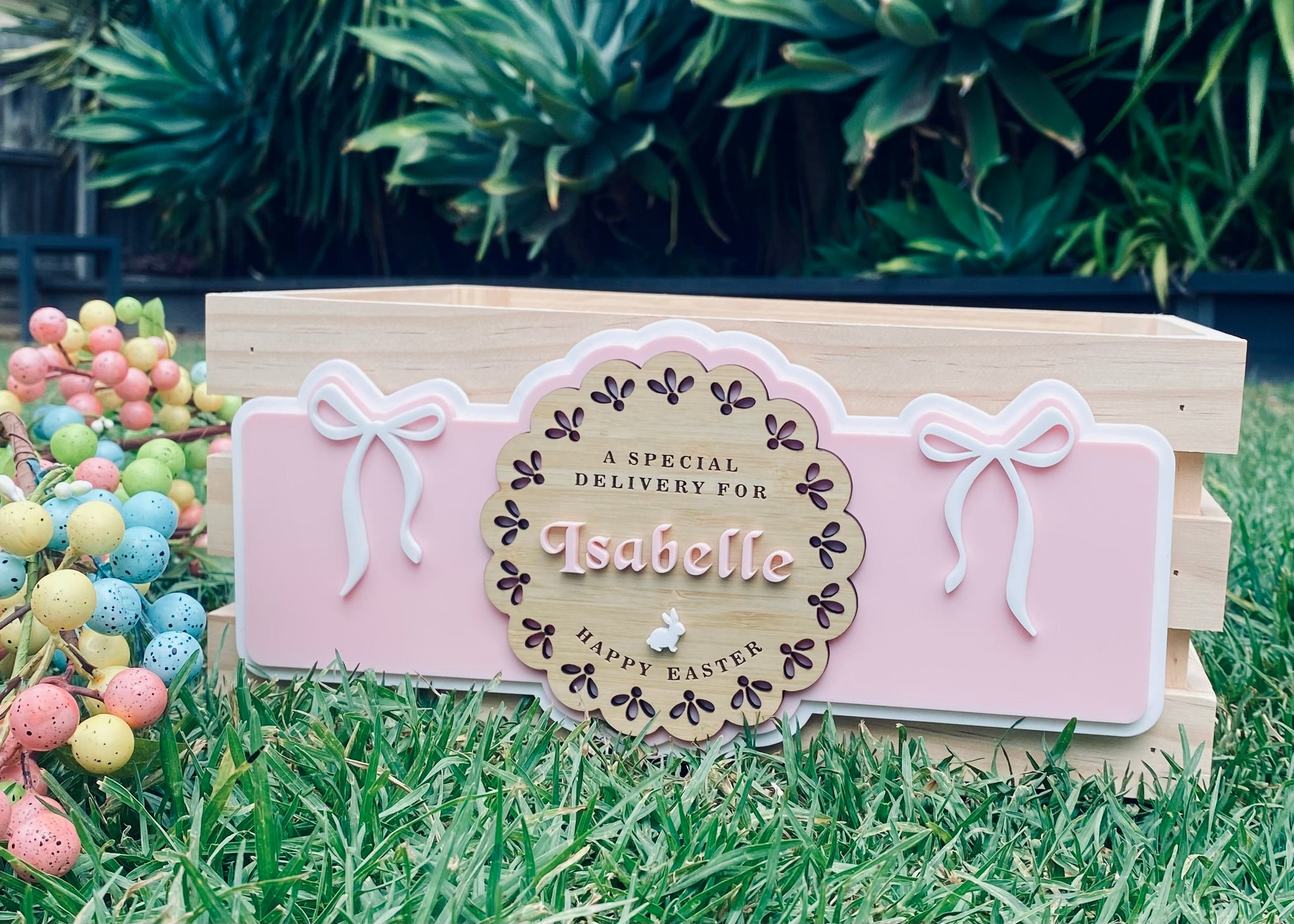 Designed to sit proudly on the front of your crate, it adds that personalised touch that turns a simple basket into a treasured Easter tradition.